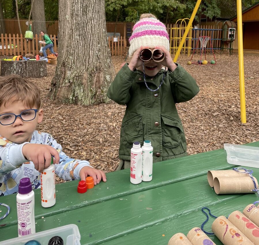 Making binoculars with toilet paper tubes, and decorating with leftover bingo daubers.