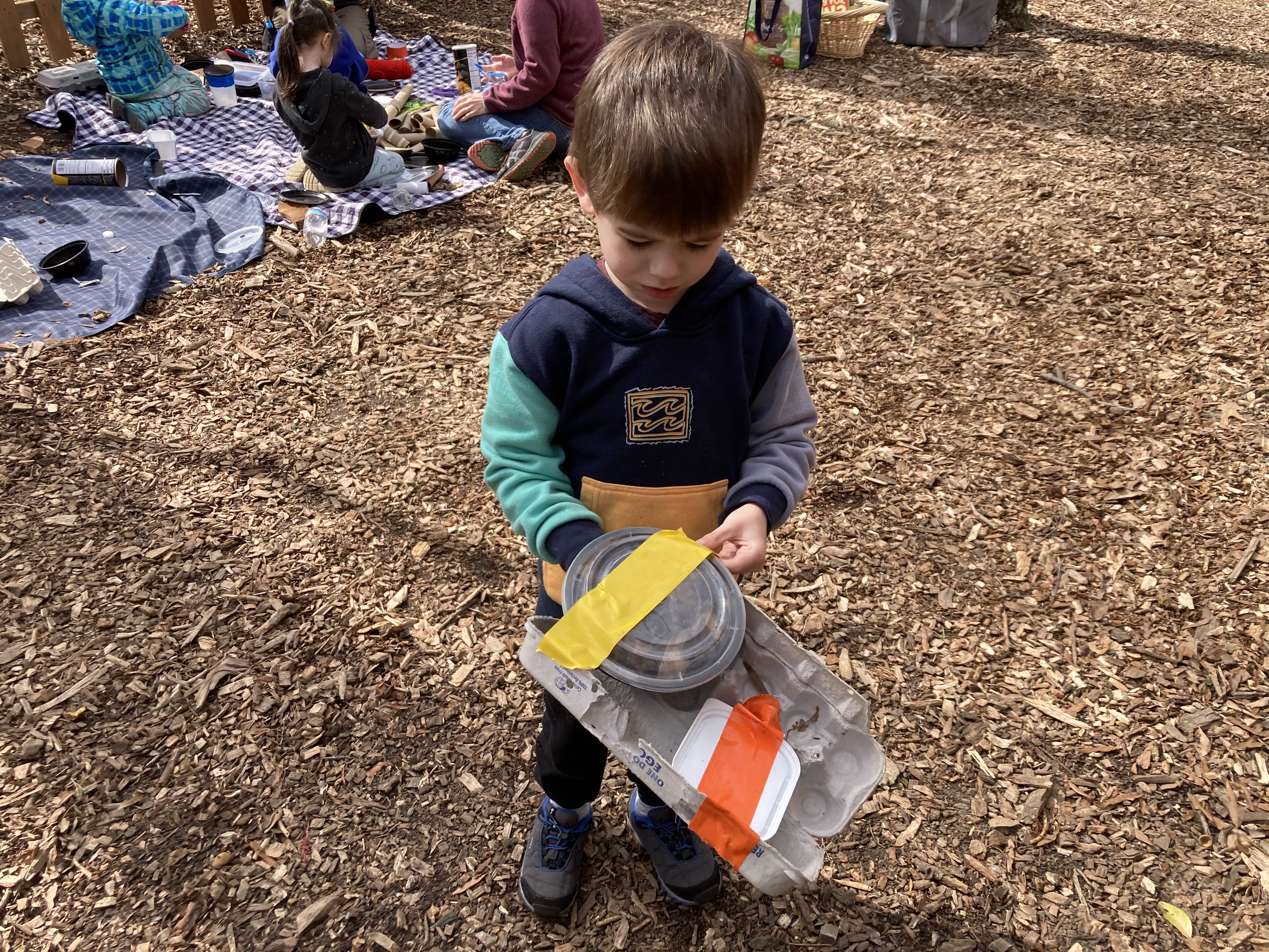 Classes take place primarily outdoors, and we have adapted in many ways to make that possible. Many supplies and activities are simply brought outdoors and used on picnic tables or blankets. We use large boards or stumps as flat bases for building. Some activities use the weather around us such as drawing in frost on a table.