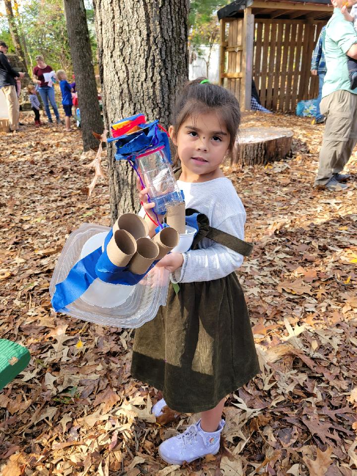 Students use recycled items to create many new things for art or play. They make binoculars, cars, ships, and many other things from used containers, paper rolls, boxes, packing paper and material, and other items collected by our families and staff.
