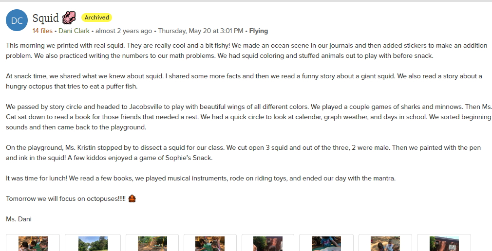 Our 4 year old Pre-K classes made paint prints with squid, shared squid facts, and then dissected squid. They distinguished male and female squid, and drew in their journals and painted with the squid ink.