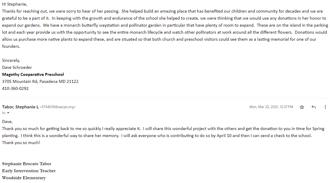 Correspondence organizing the memorial donation for the Monarch Garden expansion project.