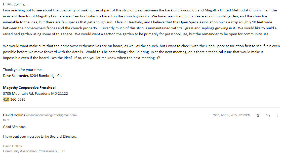 Correspondence with Deerfield Open Space Association beginning the process of approving the space for use as a school and community vegetable garden.