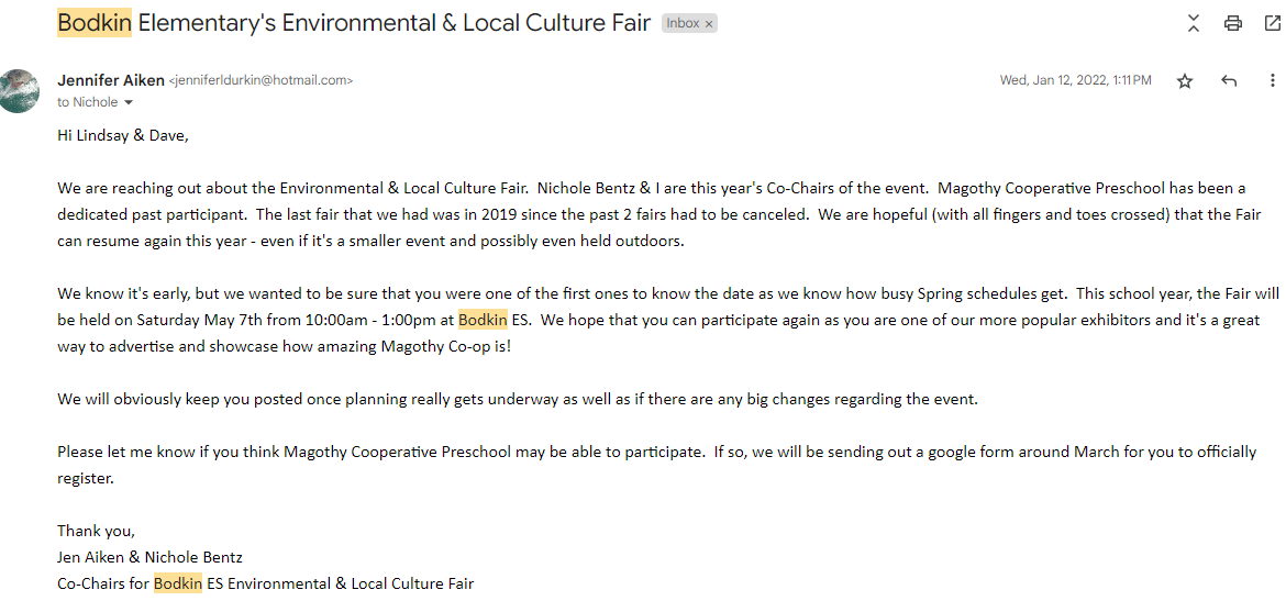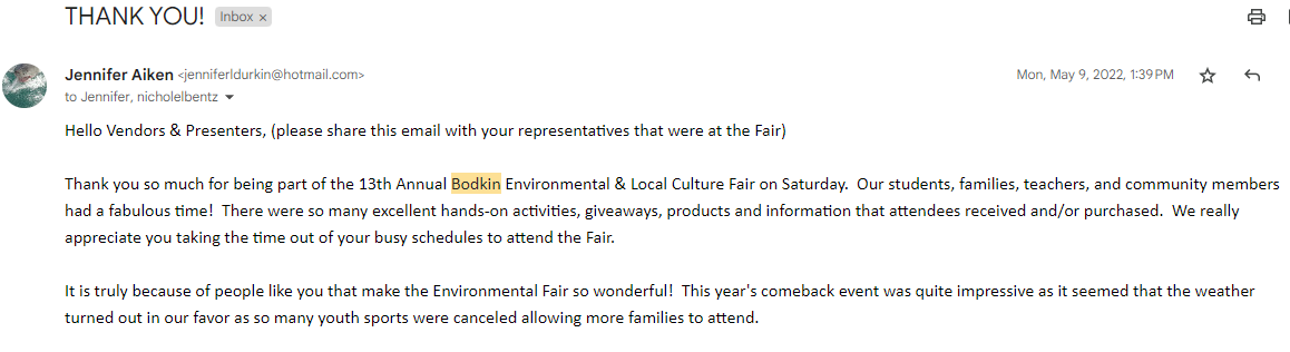 Each year Bodkin Elementary School hosts an environmental fair with vendors and educational groups whose focus is environmentally friendly and/or culturally unique in nature. We exhibit each year, sharing classroom pets, nature themed craft projects, and talking about our nature based program.