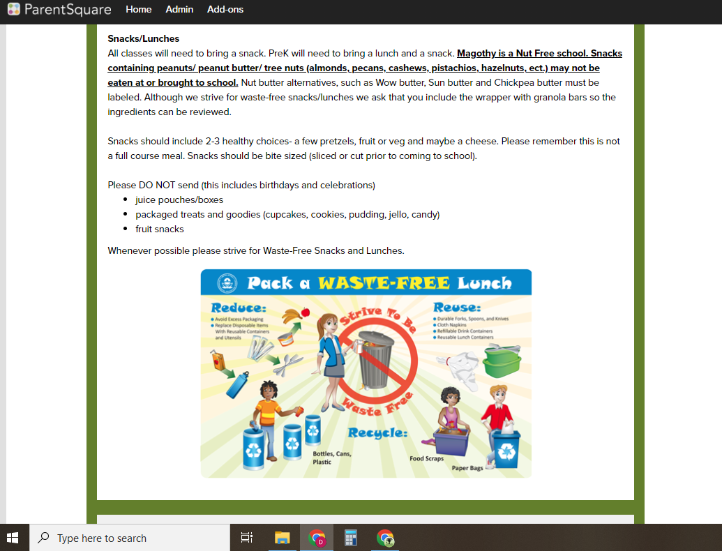 Online newsletter to parents detailing our waste free lunch and snack policy, along with suggestions.
