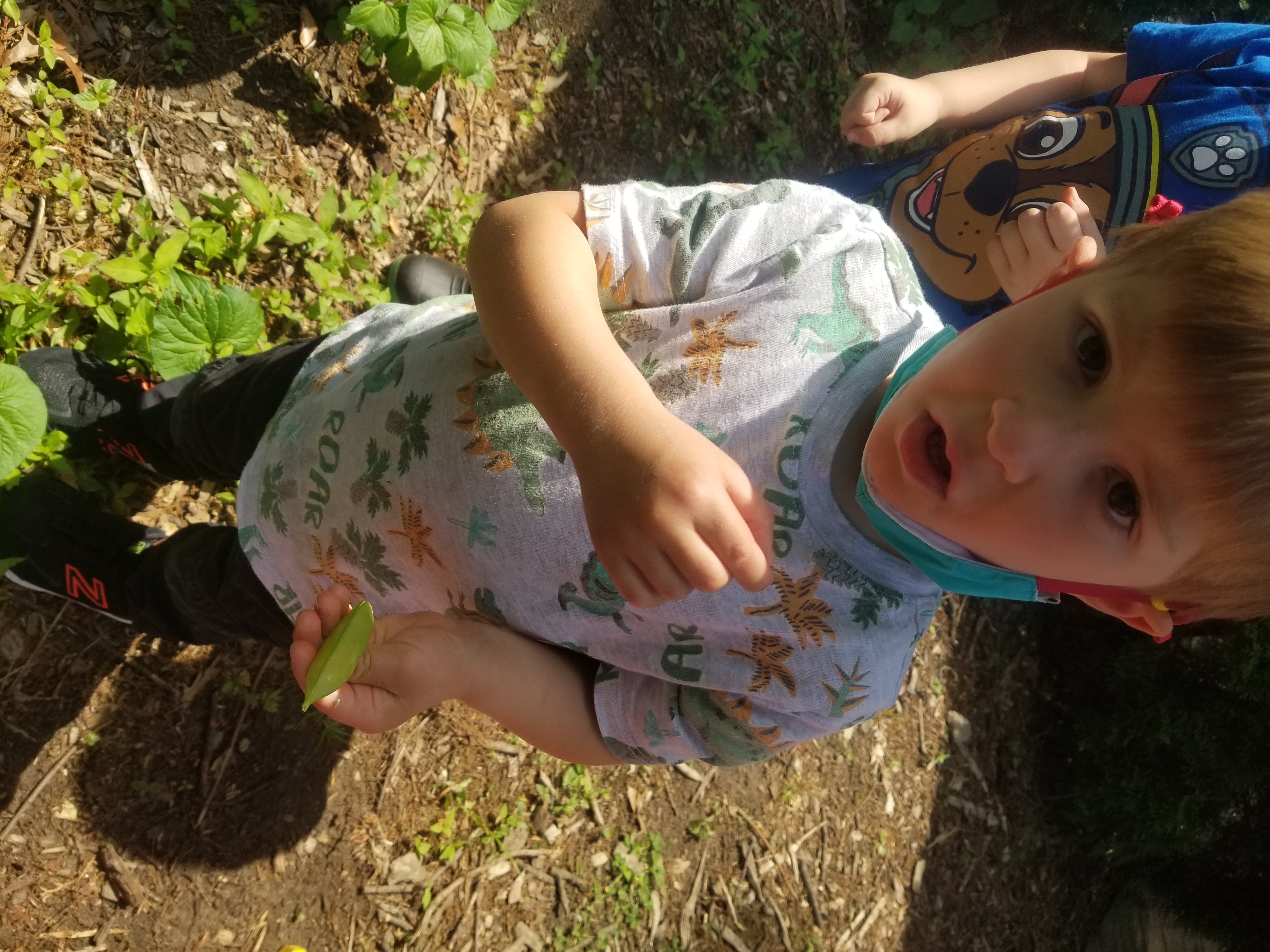 Students in our Pre-K classes assist with and observe the growth of snap pea plants in our small container gardening area. They see them from sprouts, to vines growing up sticks, to flowers, and finally pea pods that they sample.