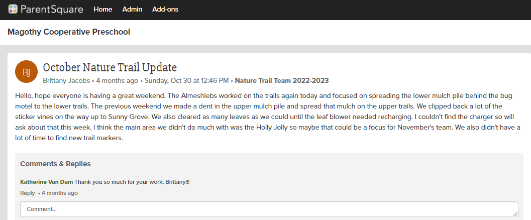 Message between our Trail Maintenance families keeping each other updated on status.