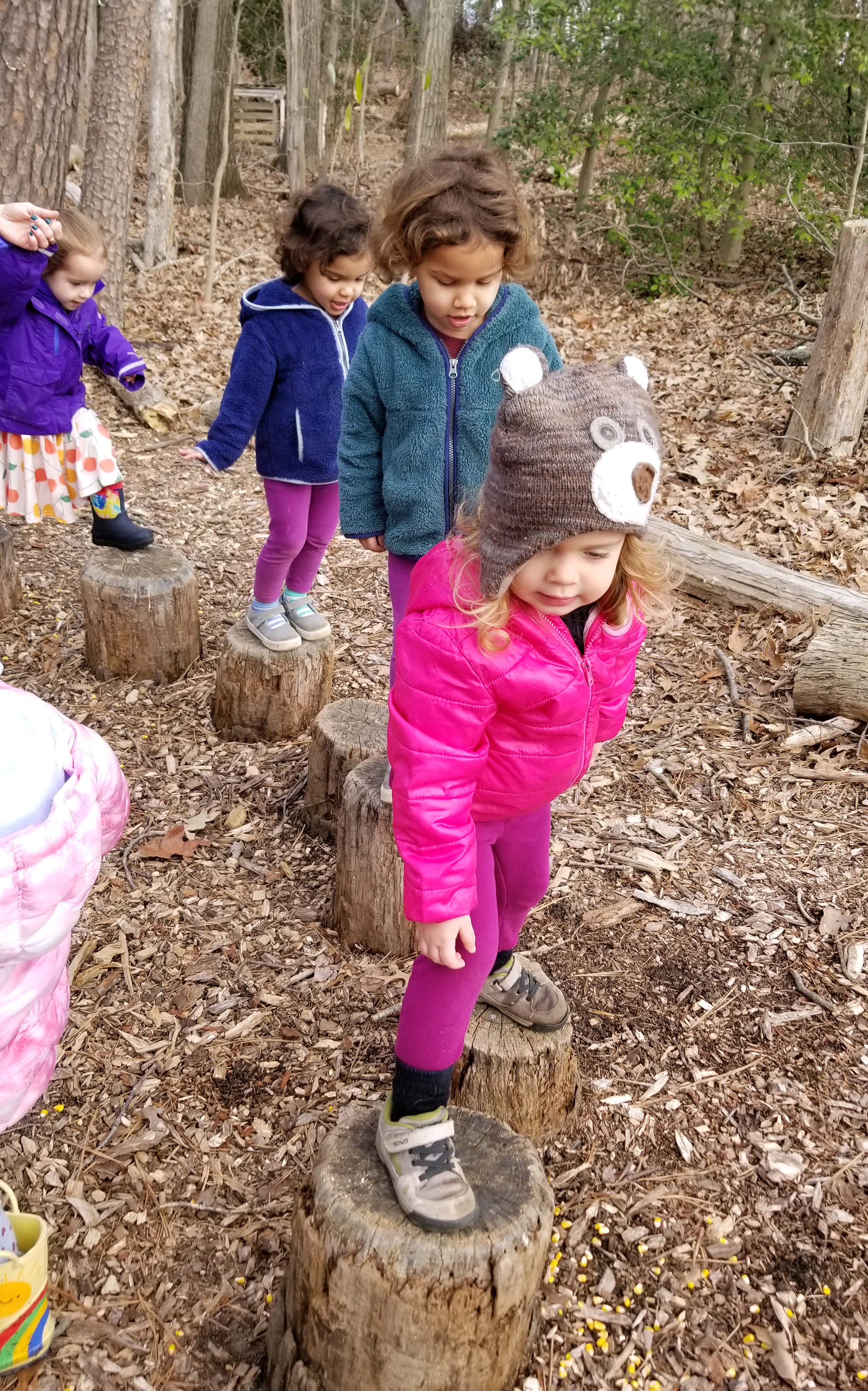 Balancing on the stump seats of the story circle in the woods