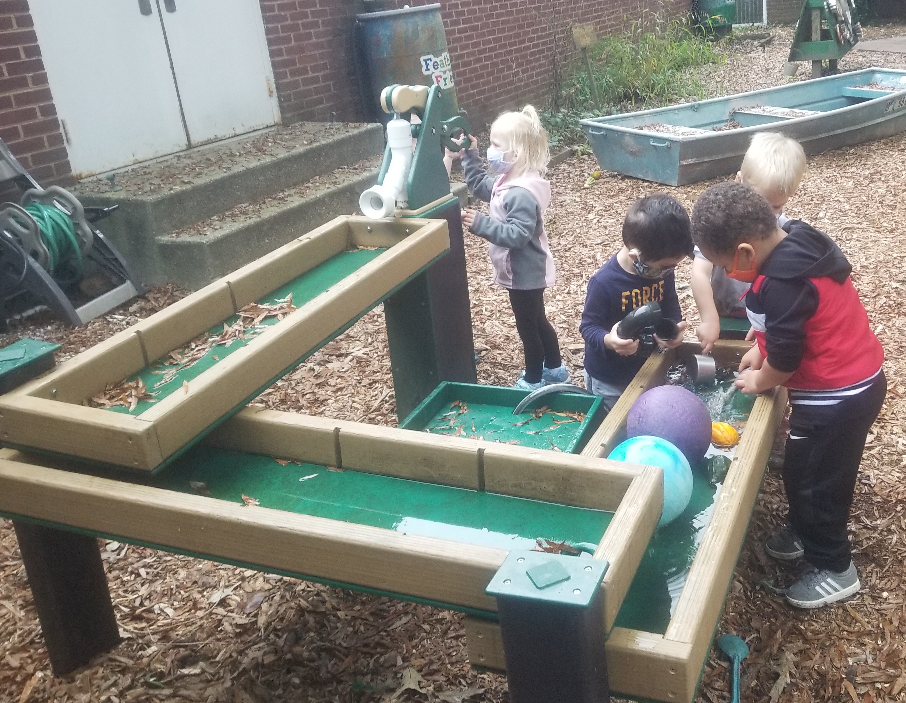 Our water play includes a recirculating water table and a pump and pipe system. These allow students to explore moving and flowing water without using too much water.