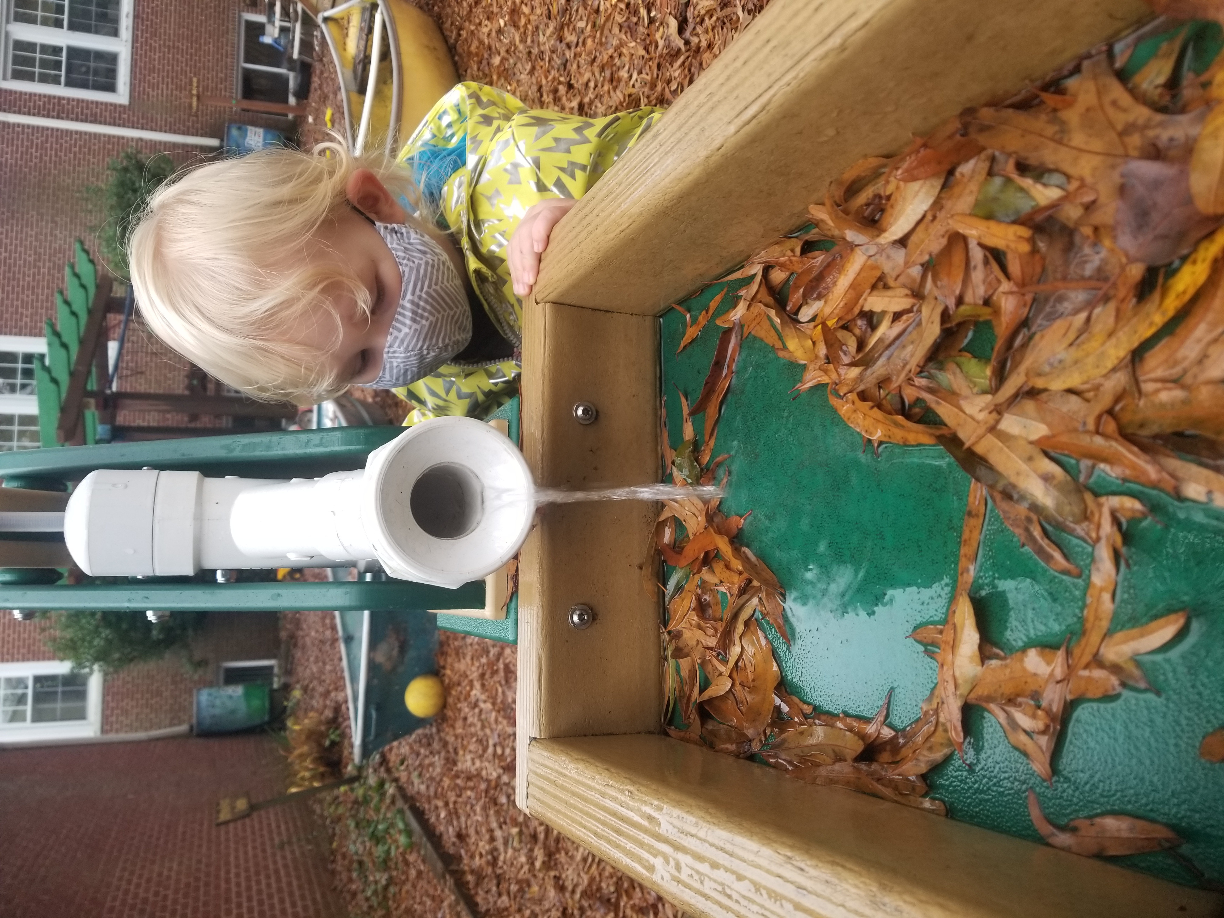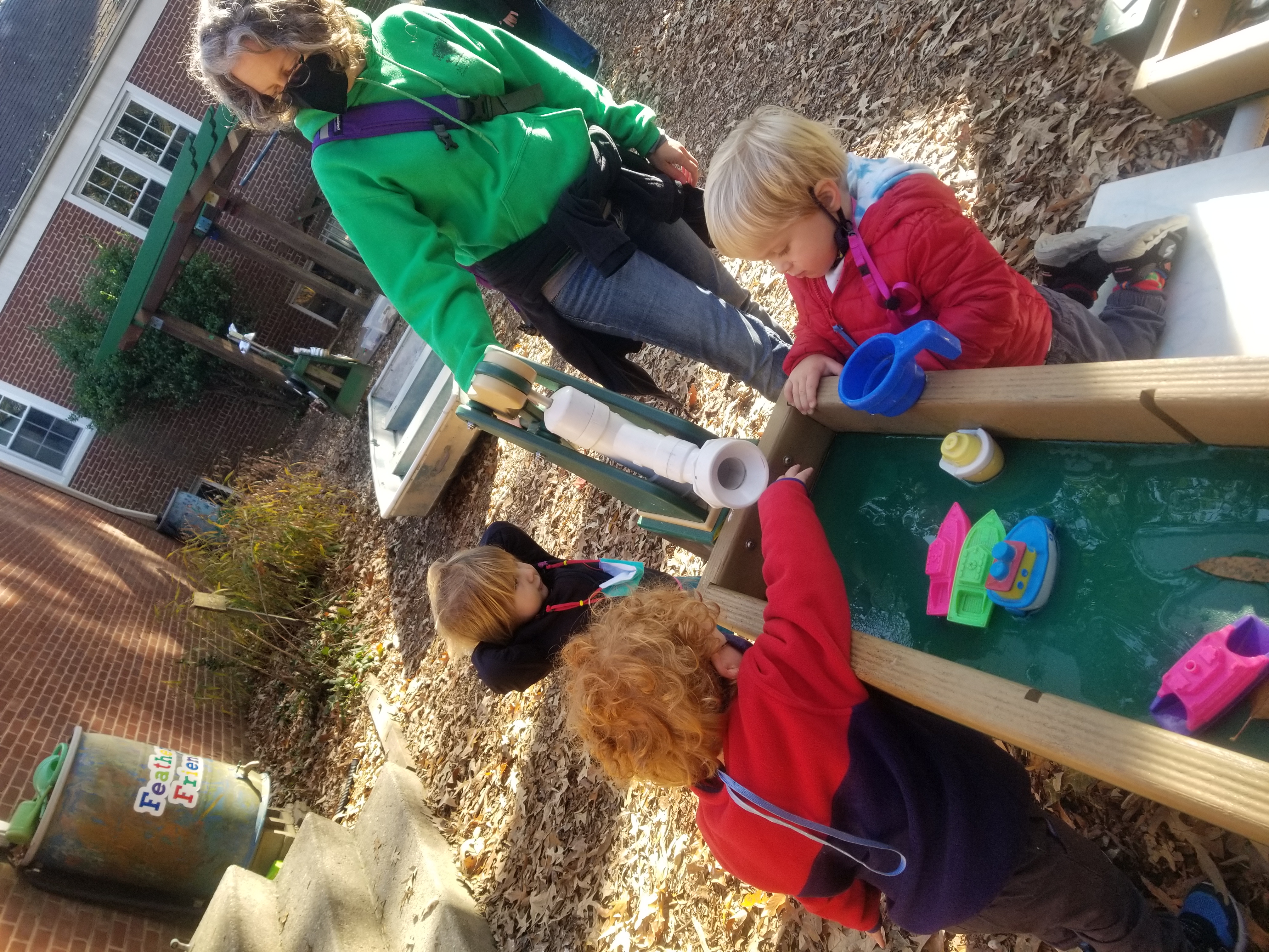 Students pump water through the water table and watch how it carries leaves and toys with the flow.
