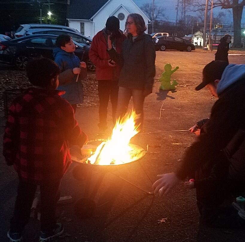 Teachers and parents monitor fire pits while the kids roast marshmallows.