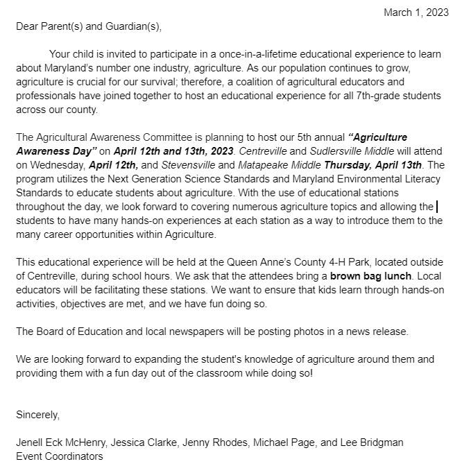 Letter to parents describing Ag Day and the importance of learning about Maryland's number one industry.