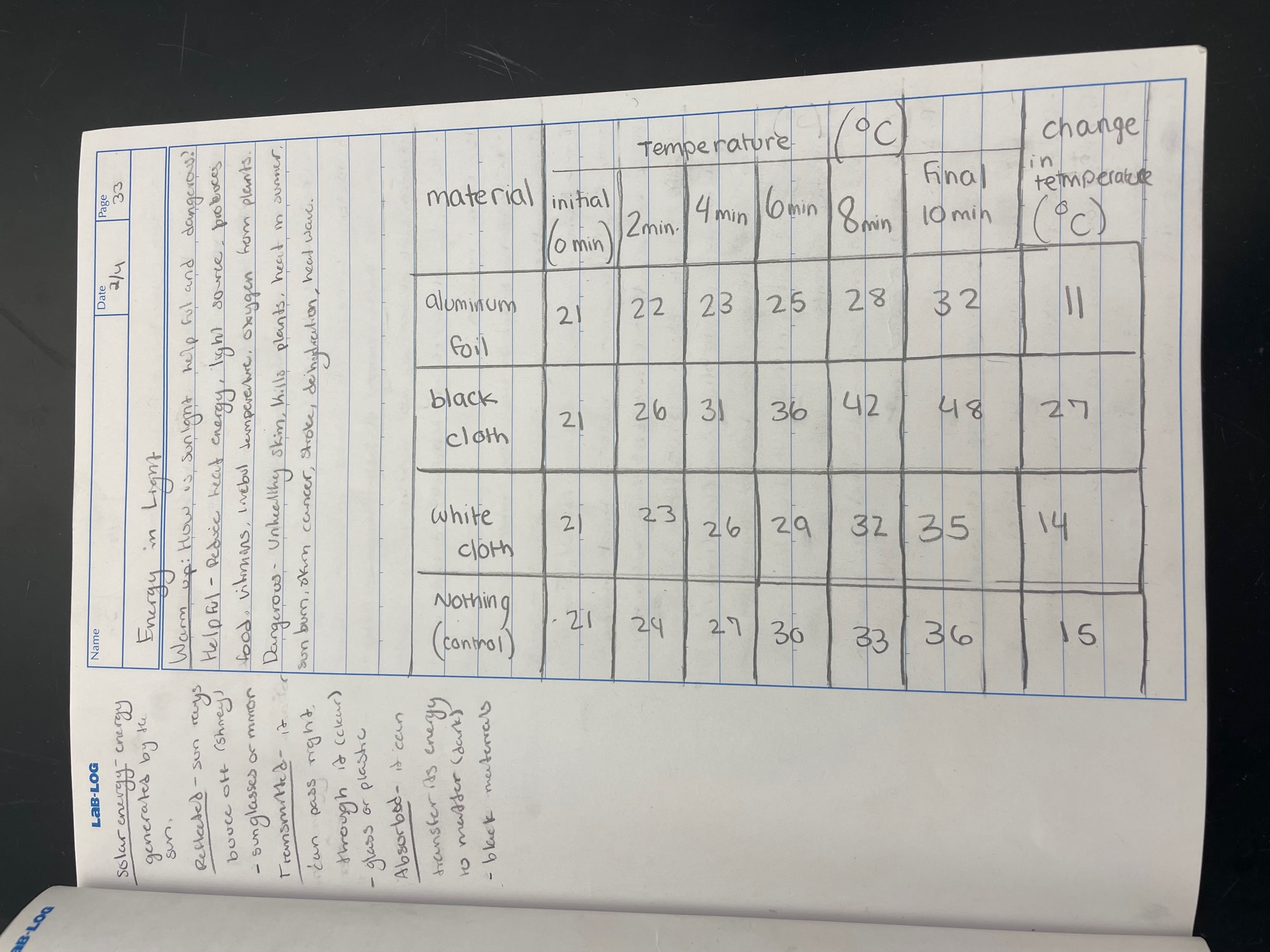Students will examine different types of materials (black and white cloth and aluminum foil) and determine how the solar energy interacts with them differently. They will utilize the temperature difference between the three to determine this.