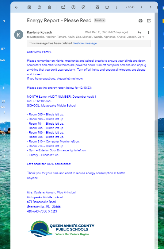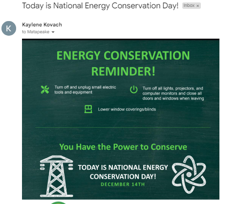Energy Report generated by the central office and disseminated to staff from the Vice Principal on reminders of steps to conserve energy.