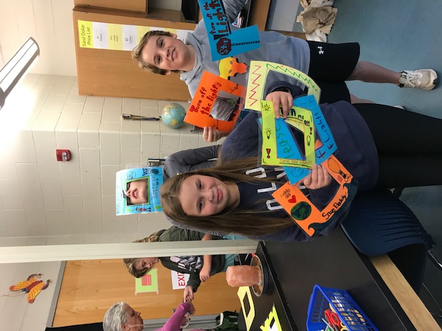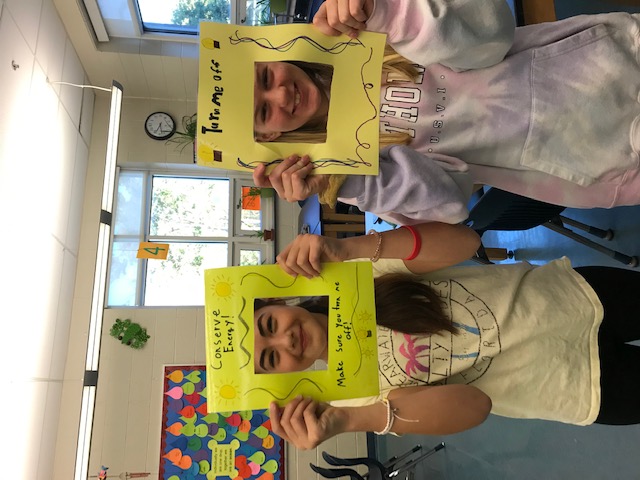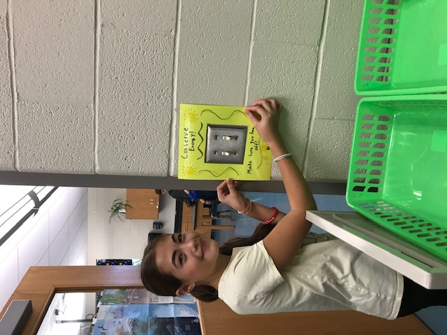 Students make posters for the light switches to remind students and staff to turn lights off in classrooms and offices.