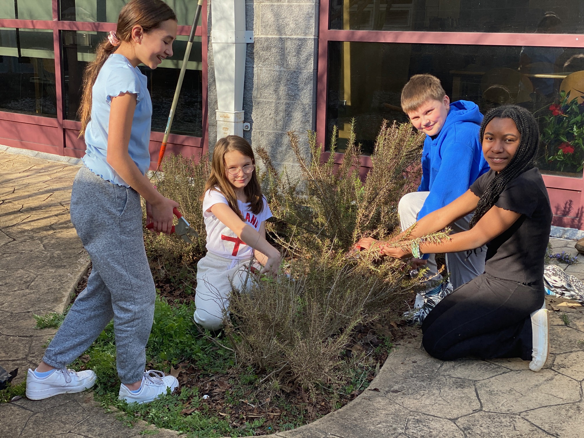 Students removed impervious surface in the courtyard and planted a herb garden to help reduce the amount of water going to the storm drain.