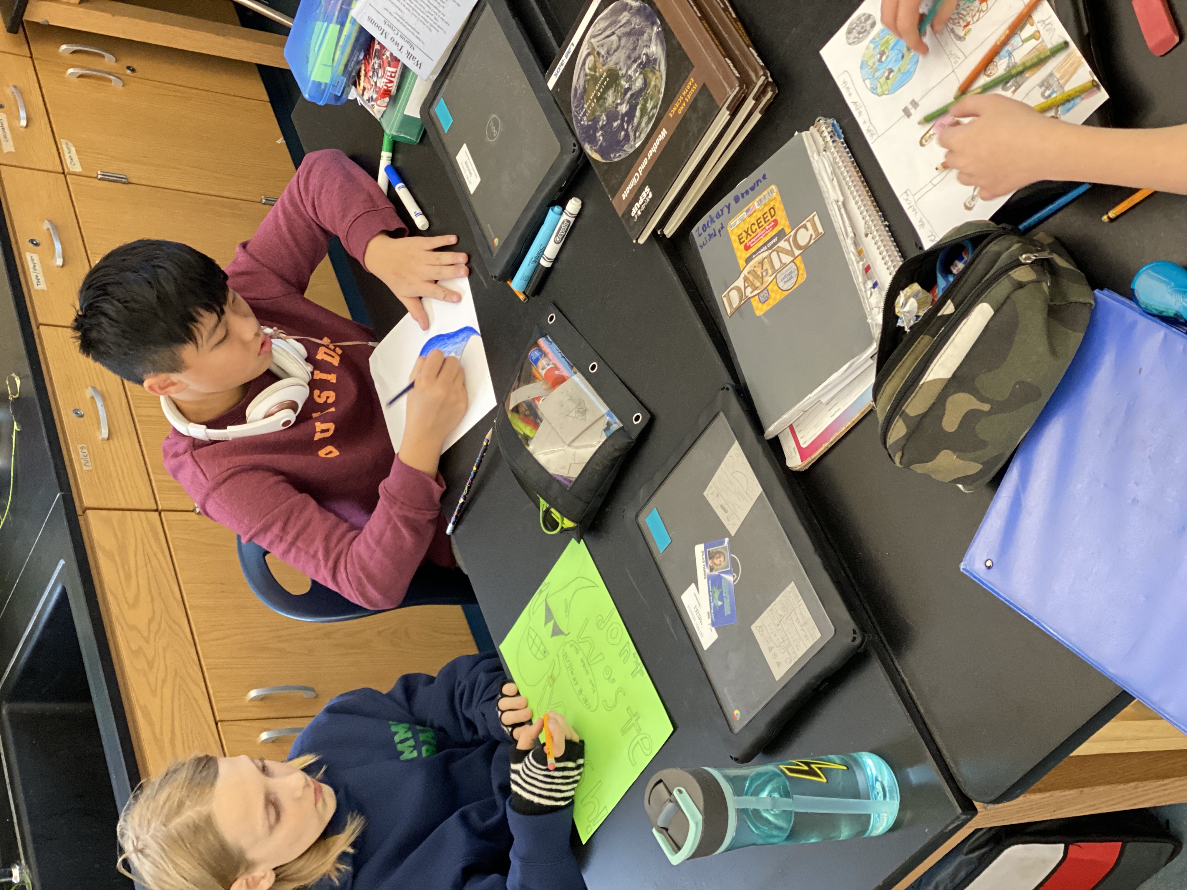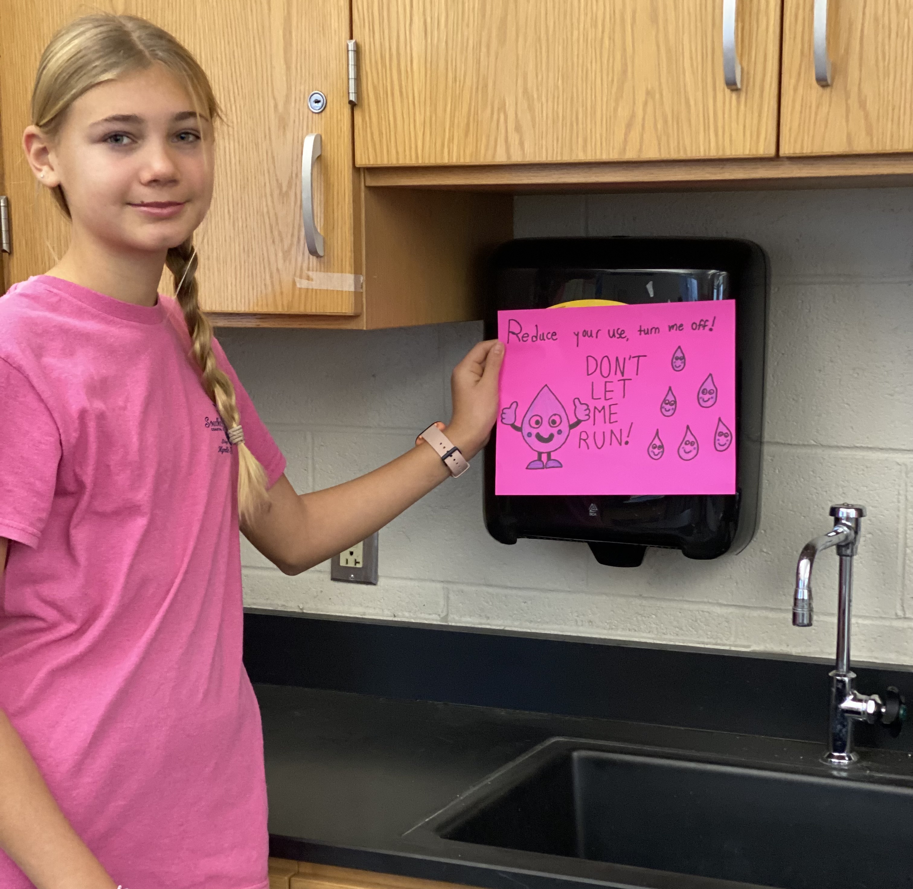 Students create signage to raise water conservation awareness in the science classrooms by creating posters encouraging students to turn off the faucet while washing hands and lab equipment.