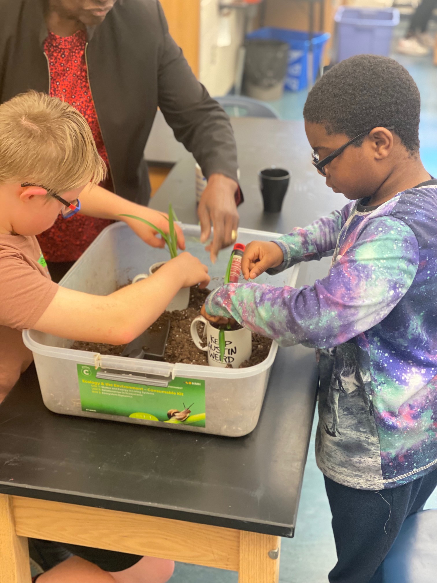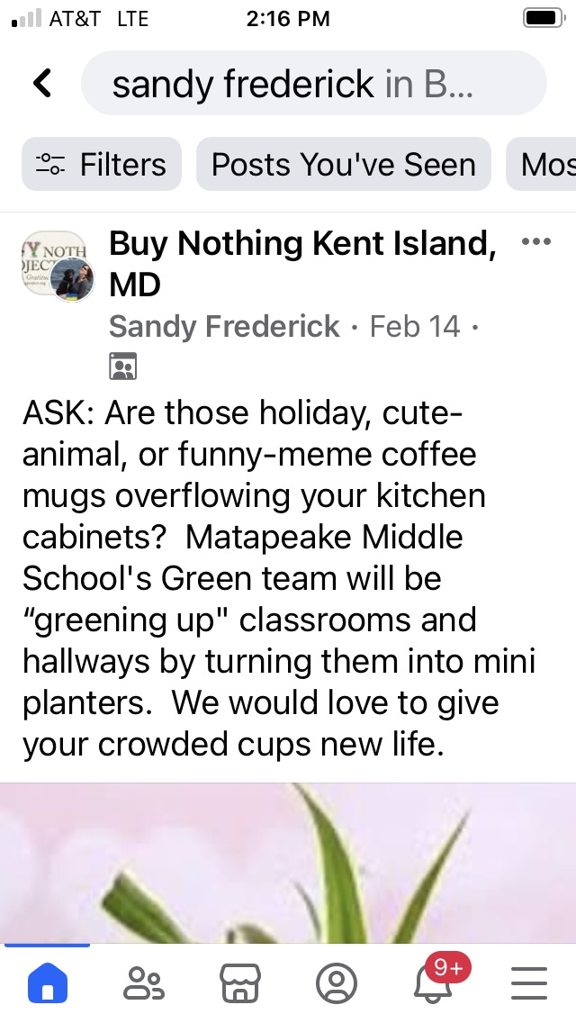 Used Coffee Mug Drive - unwanted mugs are collected from community members and planted with student propagated spider plants, aloe, and Christmas cactuses. Then they are returned to the community as presents from students.