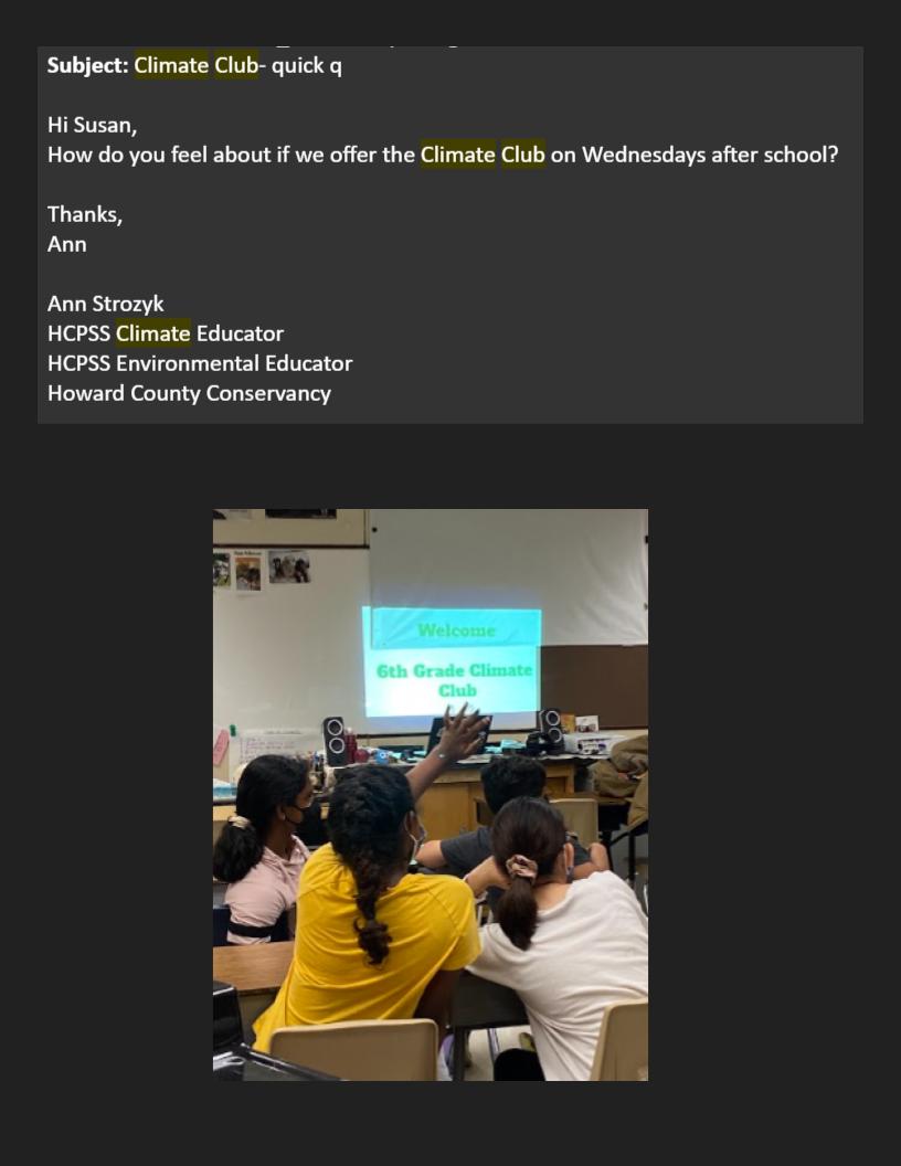 Howard Conservancy offered an opportunity for 6th grade students in Howard County to engage in a Climate Change Education summer program. MVMS had so many students interested that the Conservancy offered a special club just at MVMS during the school year so that they could accommodate students who were not selected for the summer program.