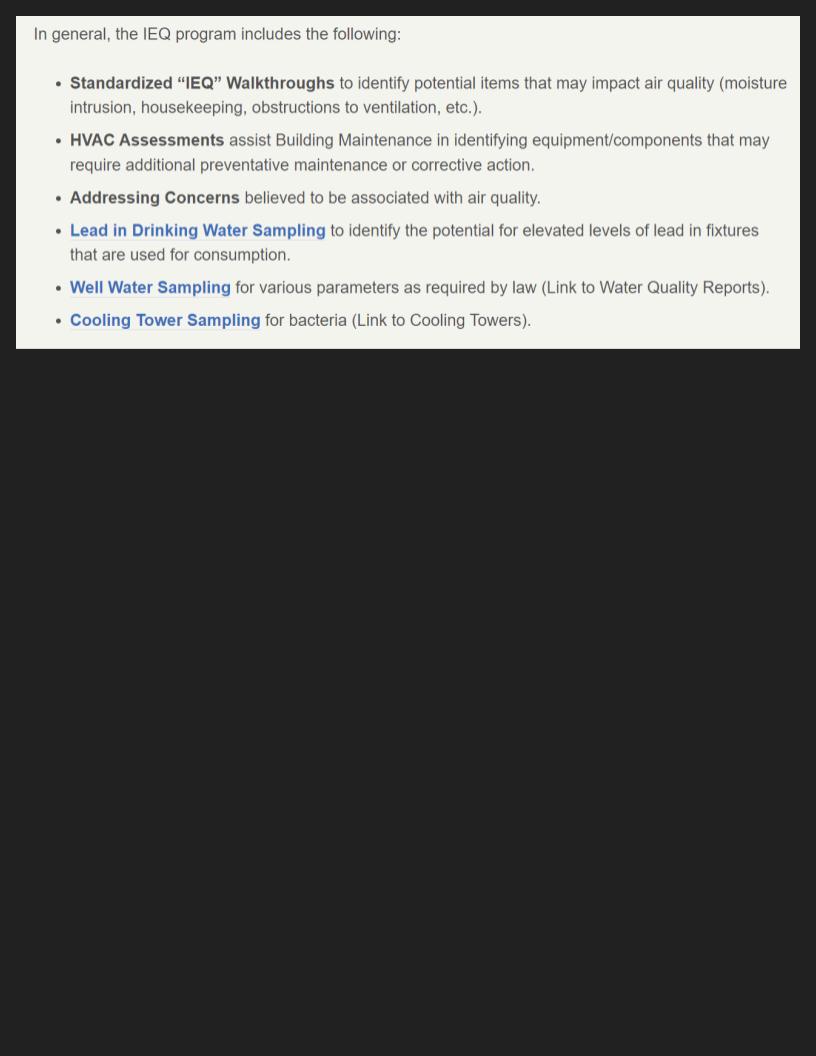 "HCPSS recognizes the importance of providing a healthy learning environment for students and staff members. In an effort to identify and correct conditions that could adversely impact indoor air and/or water quality, and in some cases to comply with applicable legal requirements, HCPSS has established various assessment and sampling programs. To provide transparency, the results and any recommended corrective actions are communicated and accessible on the page of each applicable school."