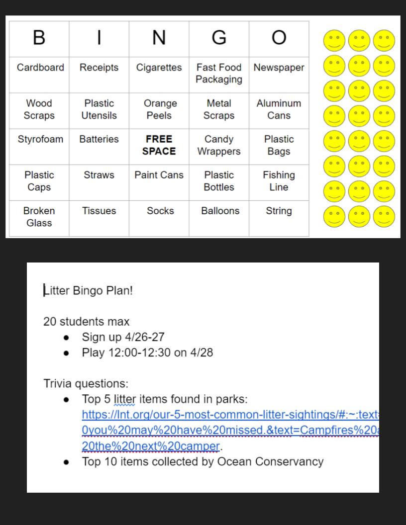 During virtual learning, 6 students in the GT Environmental Studies Seminar created a virtual bingo event that taught classmates about the impact that trash has on our watershed. Then, 24 students played litter bingo with bingo cards made by the students that featured the most common types of litter found in parks and in oceans. At the end, students were encouraged to pick up litter at their local parks.