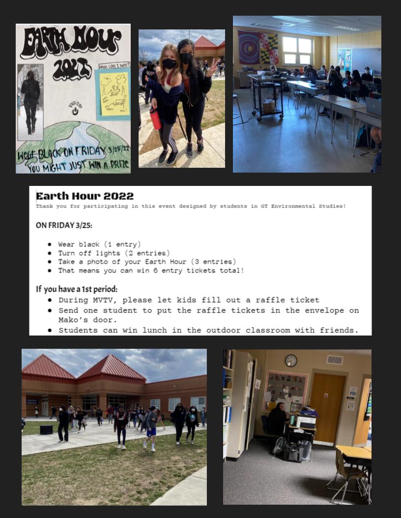 During MVMS Earth Hour, all of the teachers are encouraged to turn off their classroom lights between 8:30 am and 9:30 am to replicate the real International Earth Hour. Students all wear black clothes to school to get into the spirit, and there are announcements and videos about Earth Hour.