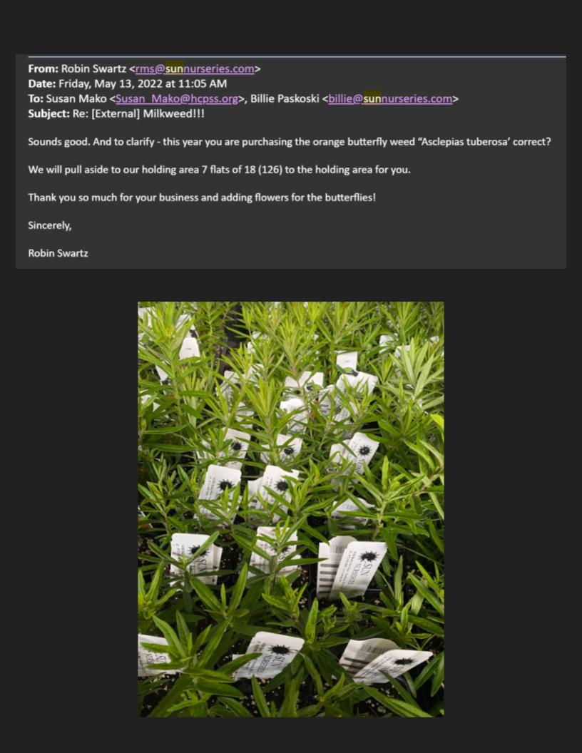 Sun Nurseries has partnered with us for our gardens and habitat restoration projects. They have provided important information concerning native plants and garden planning for our native plant educational garden. In addition, they help us run community milkweed sales to increase monarch habitat in our school community.