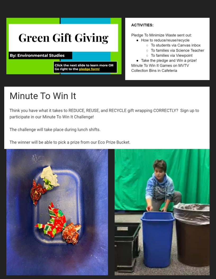 After the games, students and families were able to sign a pledge to support Mount View's efforts to "be green" by making eco friendly wrapping choices.
