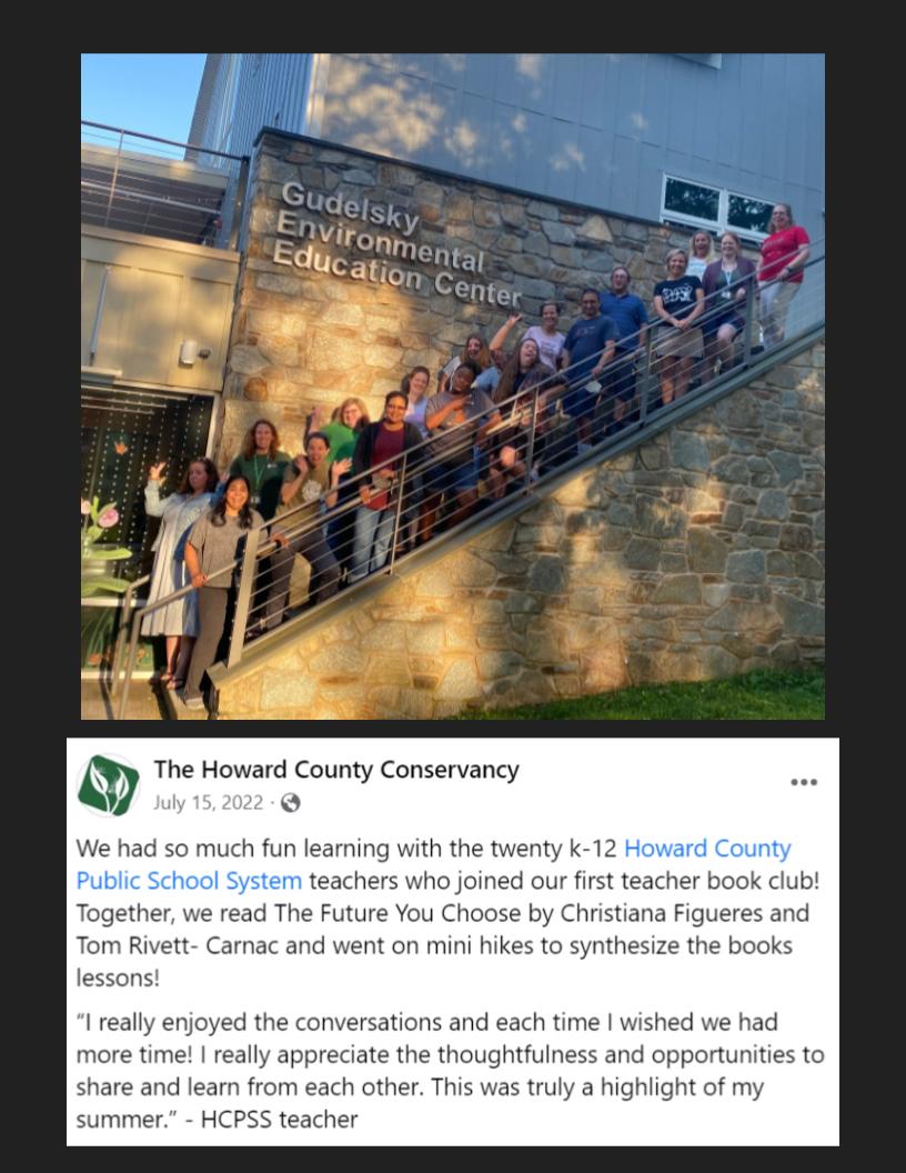 2 staff members attended 3 summer PD book talks sponsored by the Howard County Conservancy to read and discuss The Future We Choose: The Stubborn Optimist's Guide To The Climate Crisis.