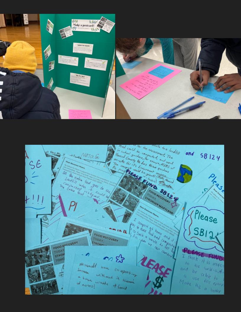 Students heard about a state bill to create school grants for composting in cafeterias. The bill needed to be funded by the governor, so 10 students in GT Environmental Studies organized a school campaign to create postcards that would encourage funding. More than 60 students wrote postcards that were sent to Annapolis.