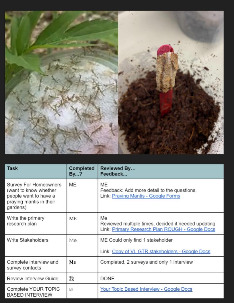 During the 21-22 school year, 35 students in GT Environmental Studies raised and released the mantises. They created announcements to share with the whole school when the mantises were released in our school gardens.