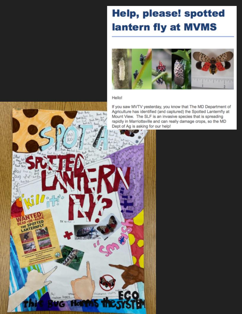 An announcement written by students goes out to the school community about the spotted lanternfly (top)