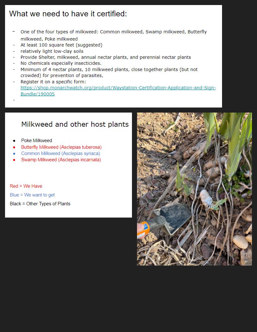 A screenshot of the students' slideshow with what we need to do to get the garden certified as a monarch waystation (top)