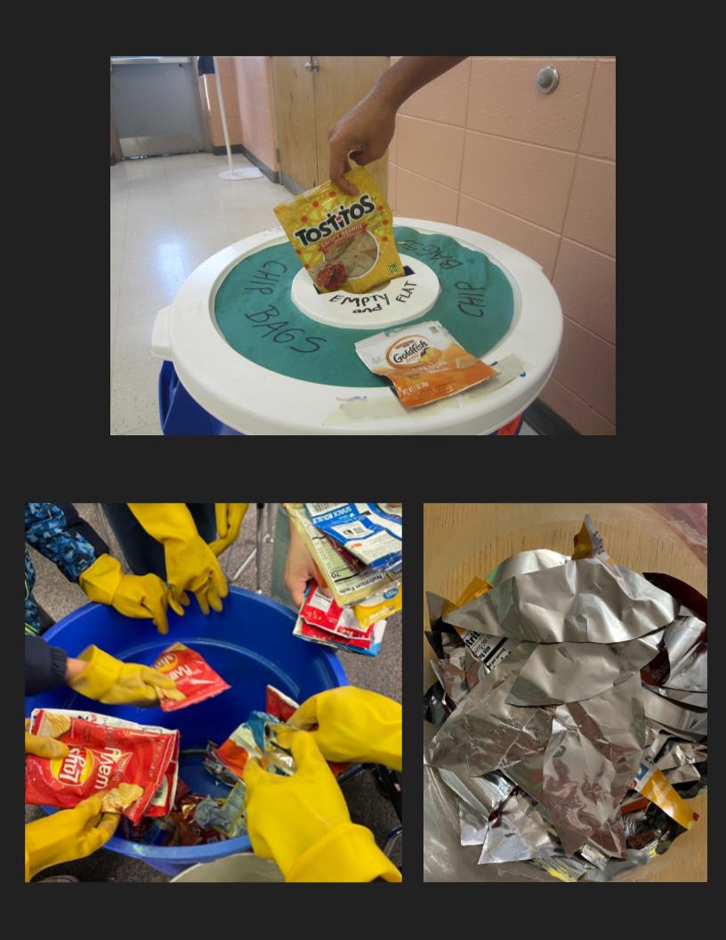 7 students in GT Environmental Stewardship conducted a trash audit in the cafeteria and found that chip bags and snack wrappers were two of the most thrown away items. To repurpose this waste stream, they joined with students in GT Environmental Studies to create specialized recycling bins. The bins are emptied each week by a student crew and the chip bags and snack wrappers are now used for upcycled art projects in our school MakerSpace. We collect an average of 77 bags per week.