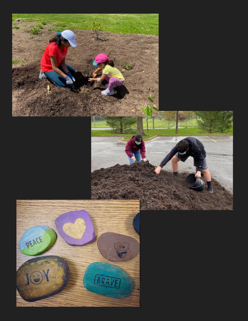 During virtual and hybrid learning, we opened our school gardens on the weekends for families to help us weed and mulch. Elementary, middle, and high school students worked in the garden each week. We also invited community members to paint rocks for the garden.