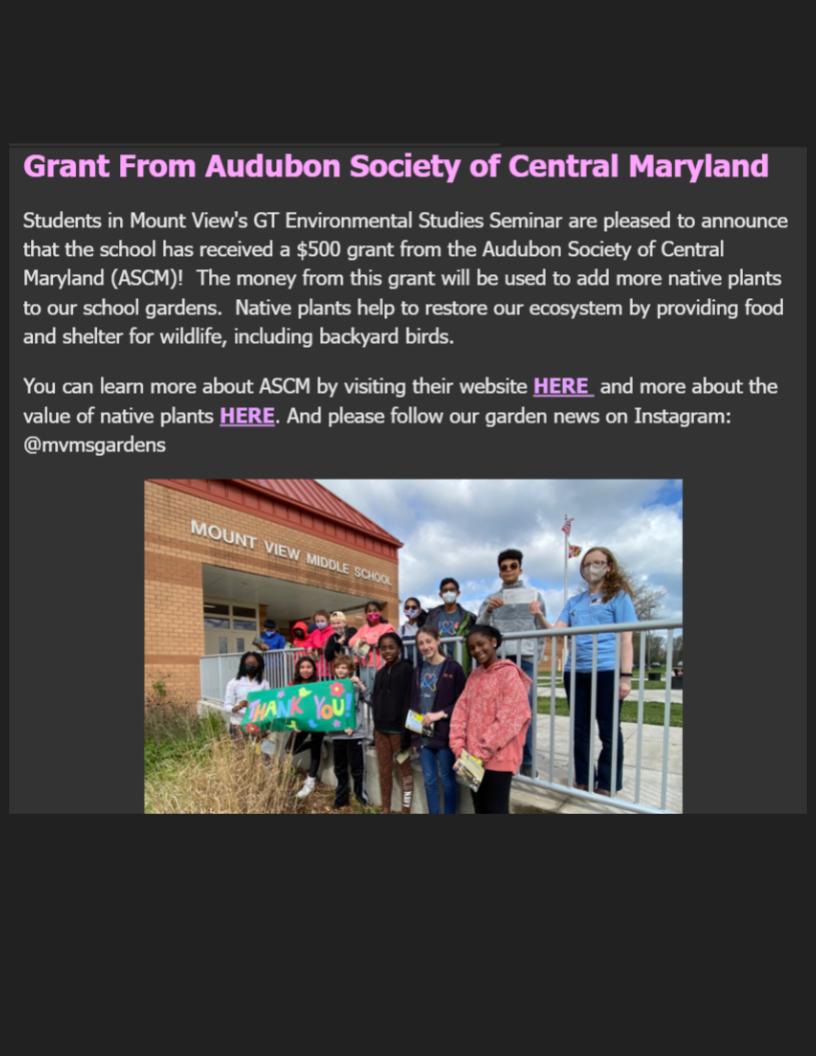MVMS received a $500 grant from the Audubon Society of Central Maryland (ASCM) to add more native plants to our school gardens thus providing food and shelter for wildlife, including backyard birds.