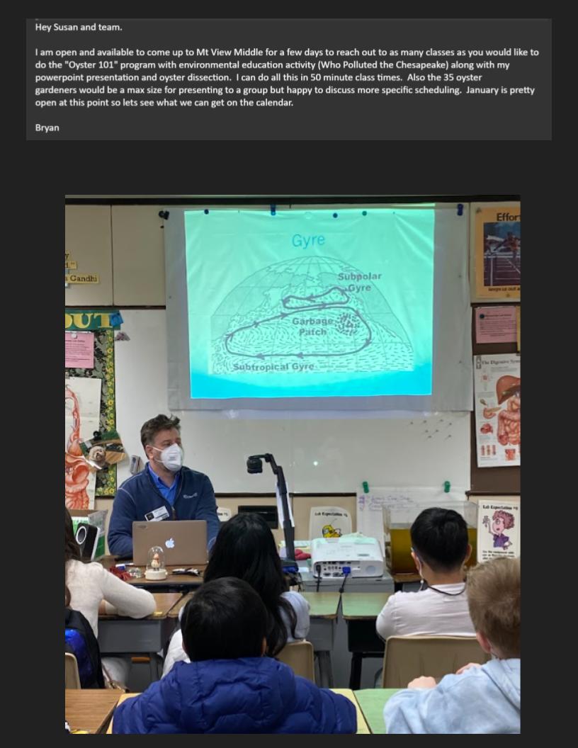ClearShark H20 works with our school's Oyster Gardening program and has expanded its partnership with MVMS to include presentations to all 7th grade science students. They have helped with our oyster cages, presented virtual lessons from the dock, and presented a classroom lesson to demonstrate how the Chesapeake Bay has become polluted over the years by human activity.