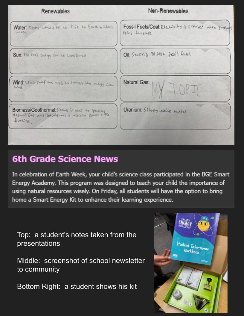 In science classes, students learned about renewable and non-renewable energy sources and the importance of using natural resources wisely. Students then researched one energy source, presented their research to each other, and took notes on each others' presentations. Students received Smart Energy Kits to take home and parents were sent information about how to use the kits with their child.