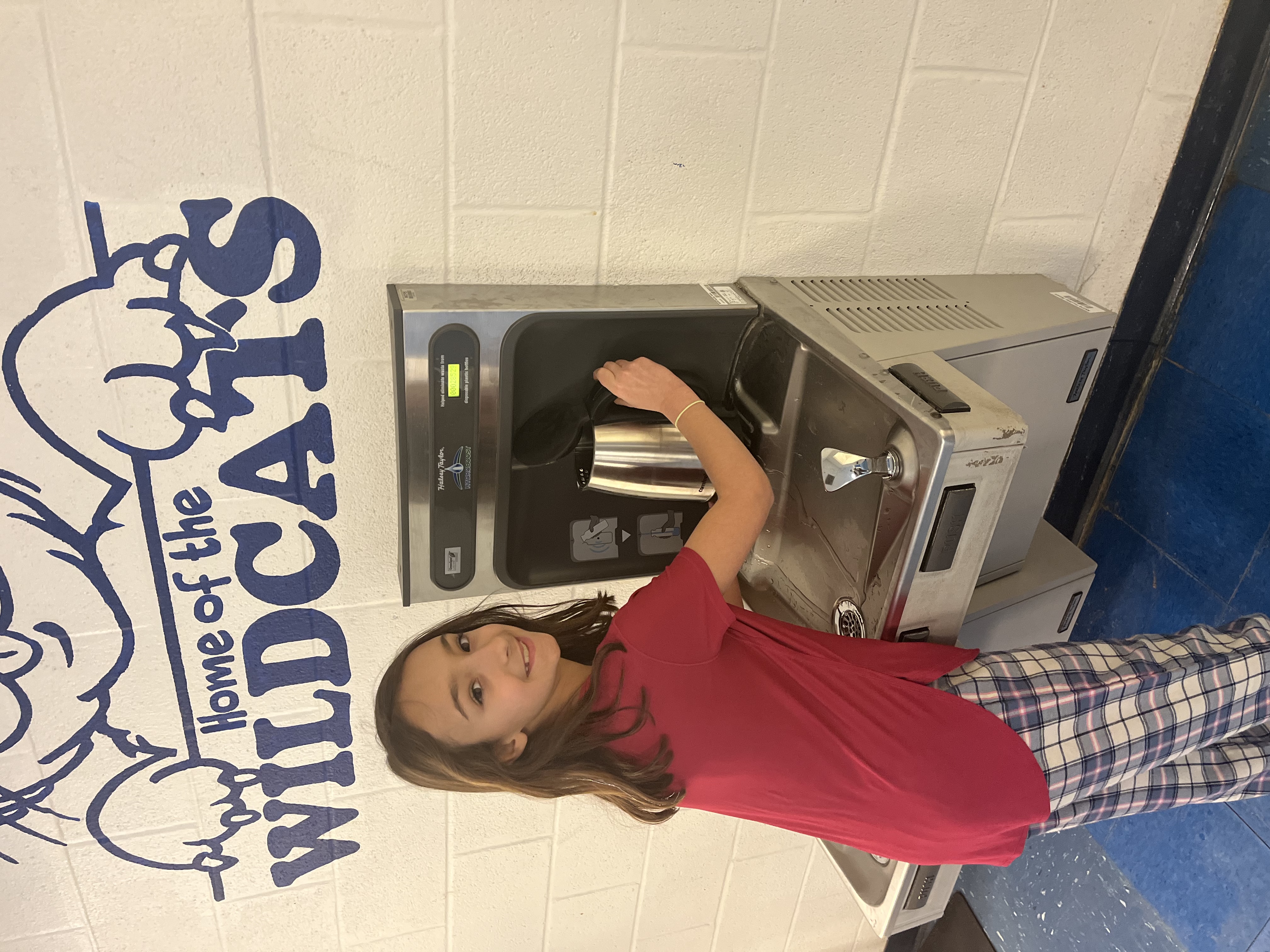 Students use the bottle filler to fill up a pitcher to reduce use of plastic bottles.